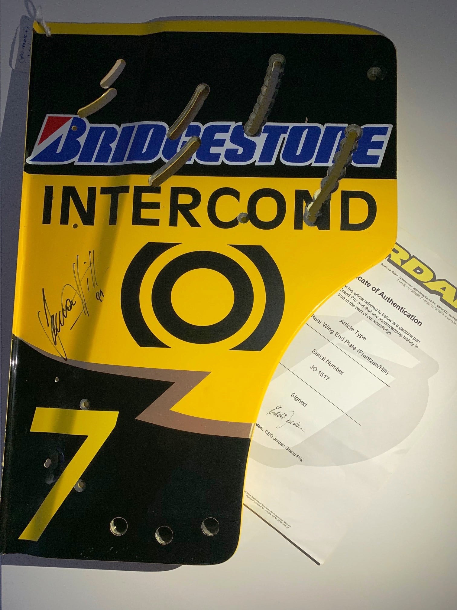 Signed Damon Hill Jordan 1999 rear wing end plate #7 with certificate of authenticity signed by Eddie Jordan.