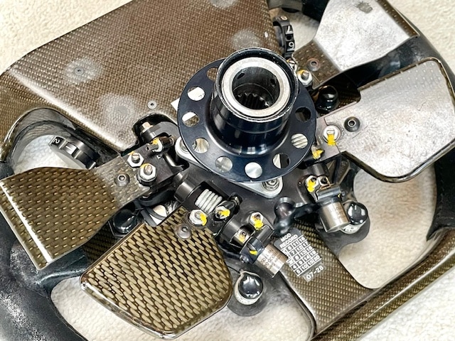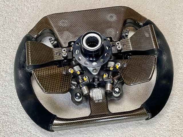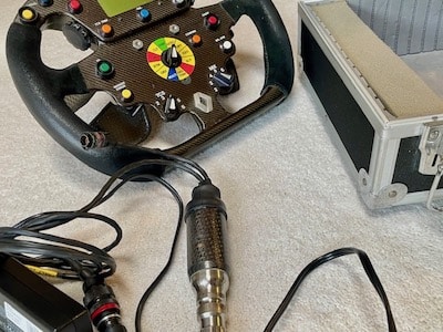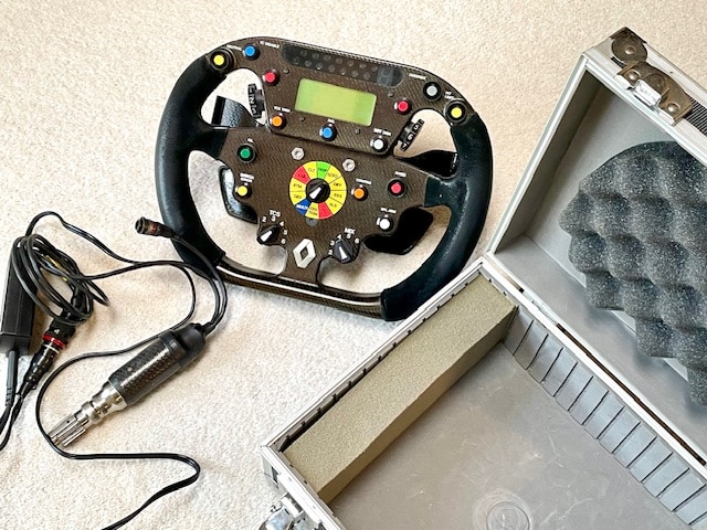 This example is race used and was adopted after the end of the 2006 season within the Enstone team for use by the drivers to test starting reaction times as well as gear change responses. Accordingly, it is offered for sale complete with a UK mains powered transformer, carbon connection module and custom umbilical that connects via the quick release spline to activate the simulation modes.