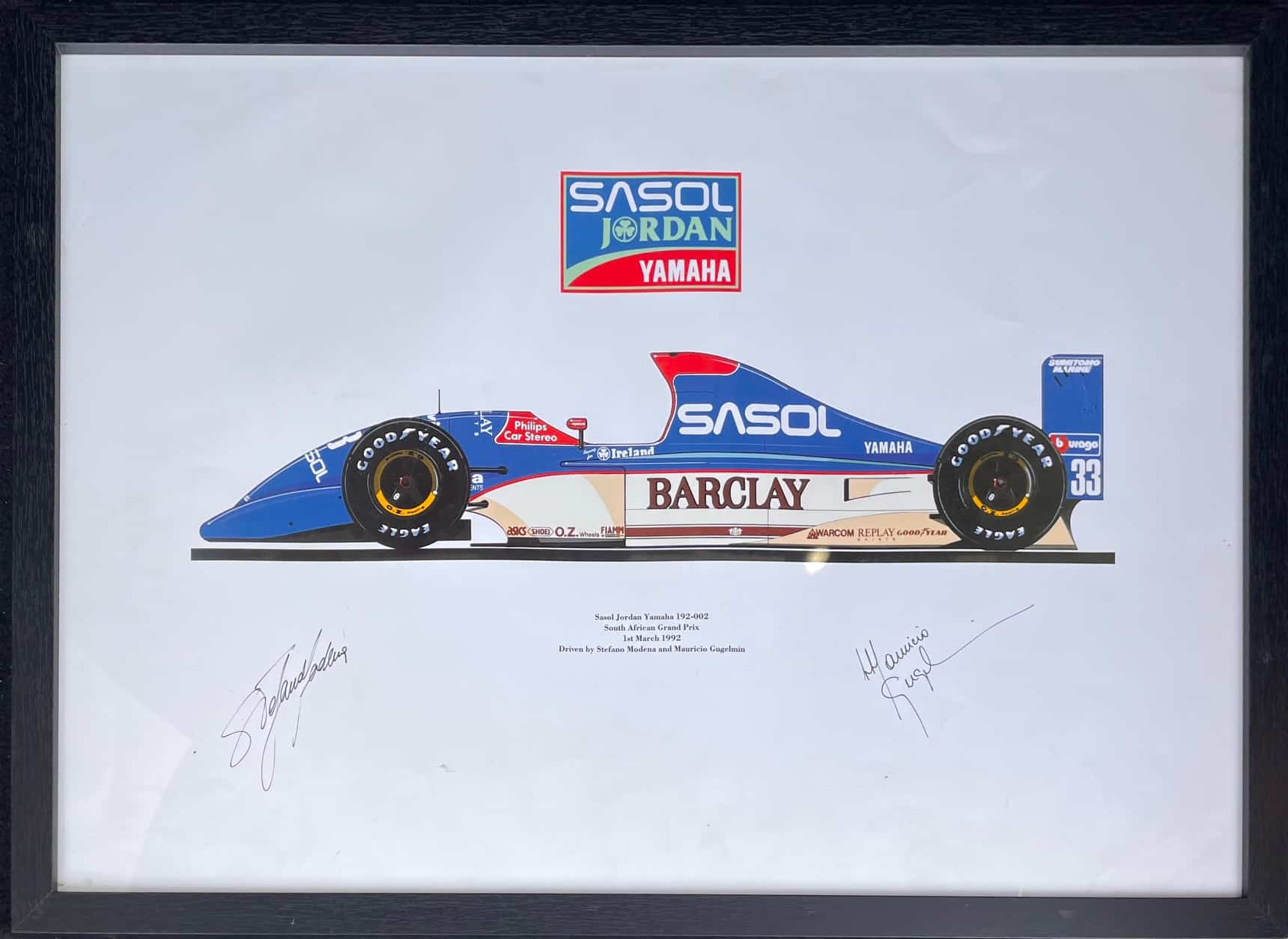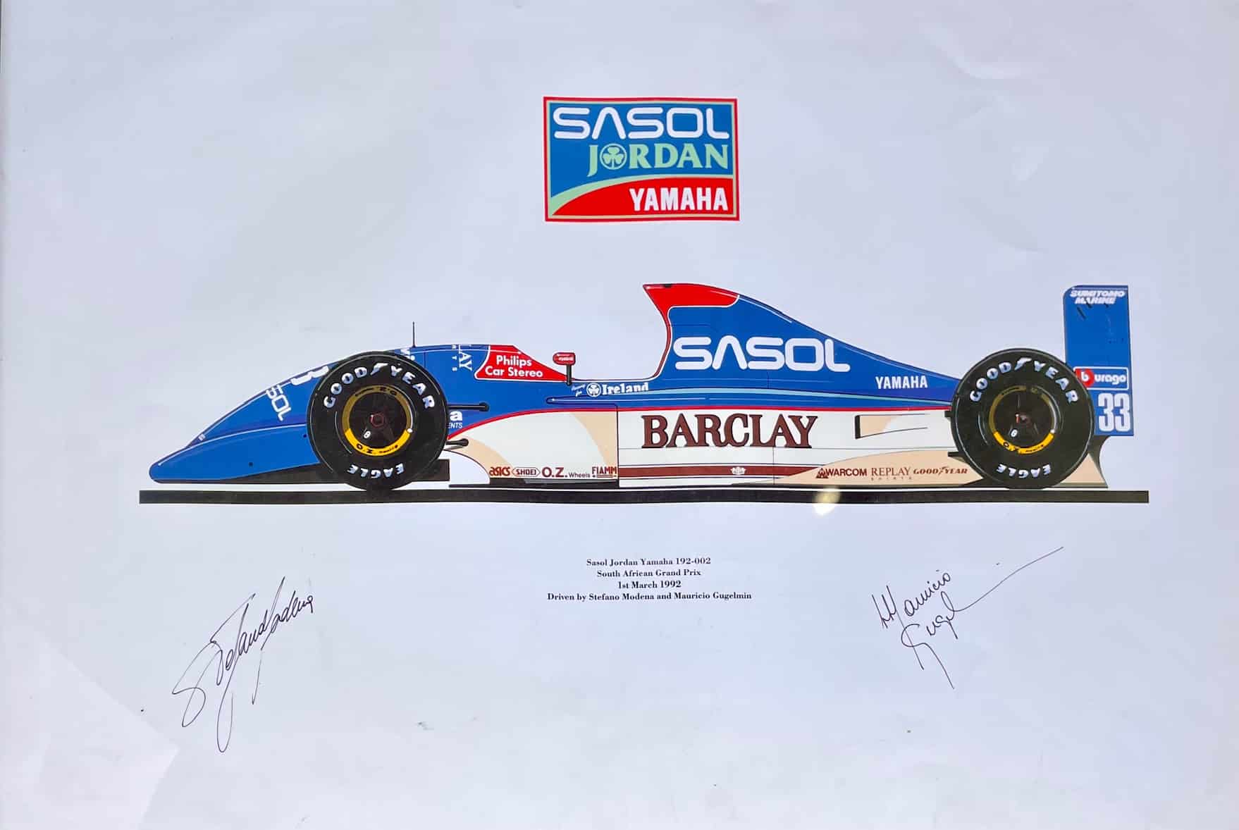 The late Ian Hutchinson designed the iconic liveries of the early Jordan F1 cars including the 1992 Sasol Jordan Yamaha 192. He drew this side profile image which was turned into a series of prints for sponsors and VIPs.