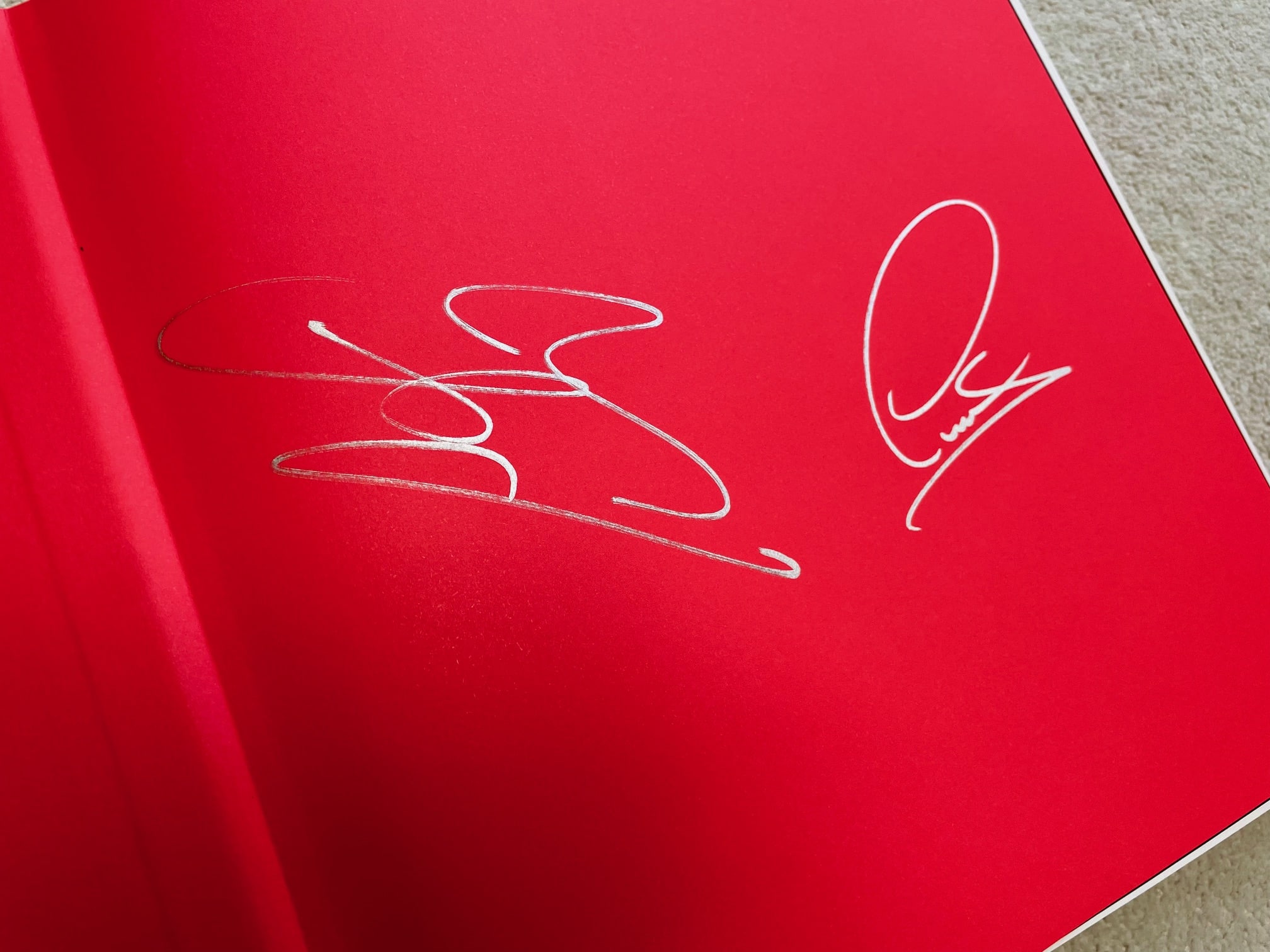 It has been signed in silver charpie to the red flyleaf by both Lewis Hamiton and Jenson Button.