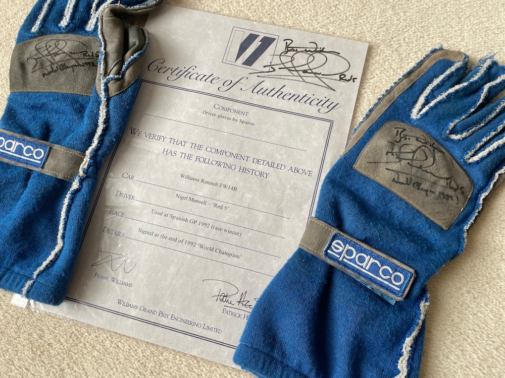 The gloves have superb provenance with a Williams Grand Prix Engineering Ltd COA explaining that they were signed after Nigel became World Champion. The COA is also dedicated ‘Best Wishes’ and countersigned by Nigel.