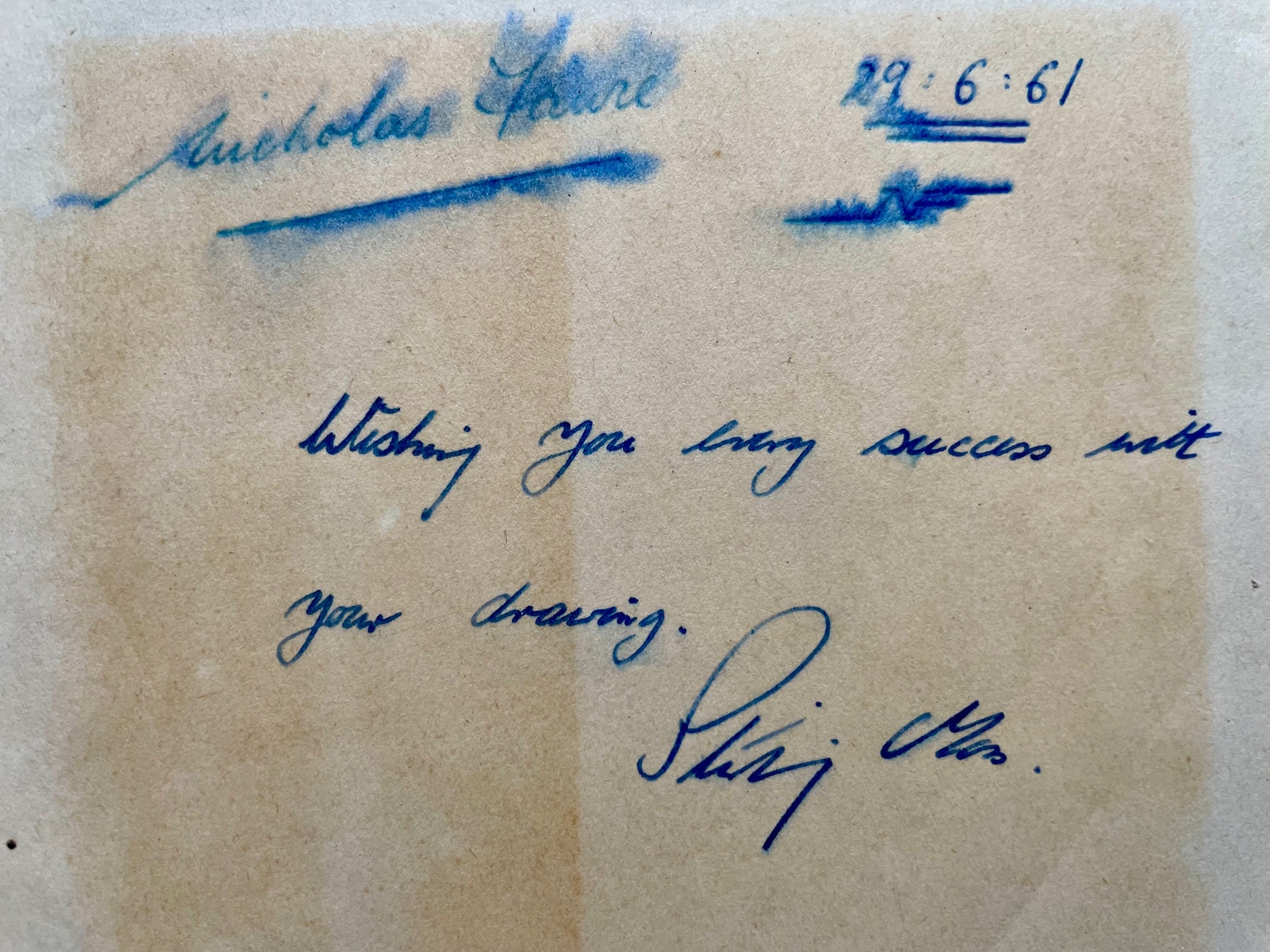 The original note is affixed to the rear of the frame, wishing Nick every success with his drawing exploits and is countersigned by Nick.