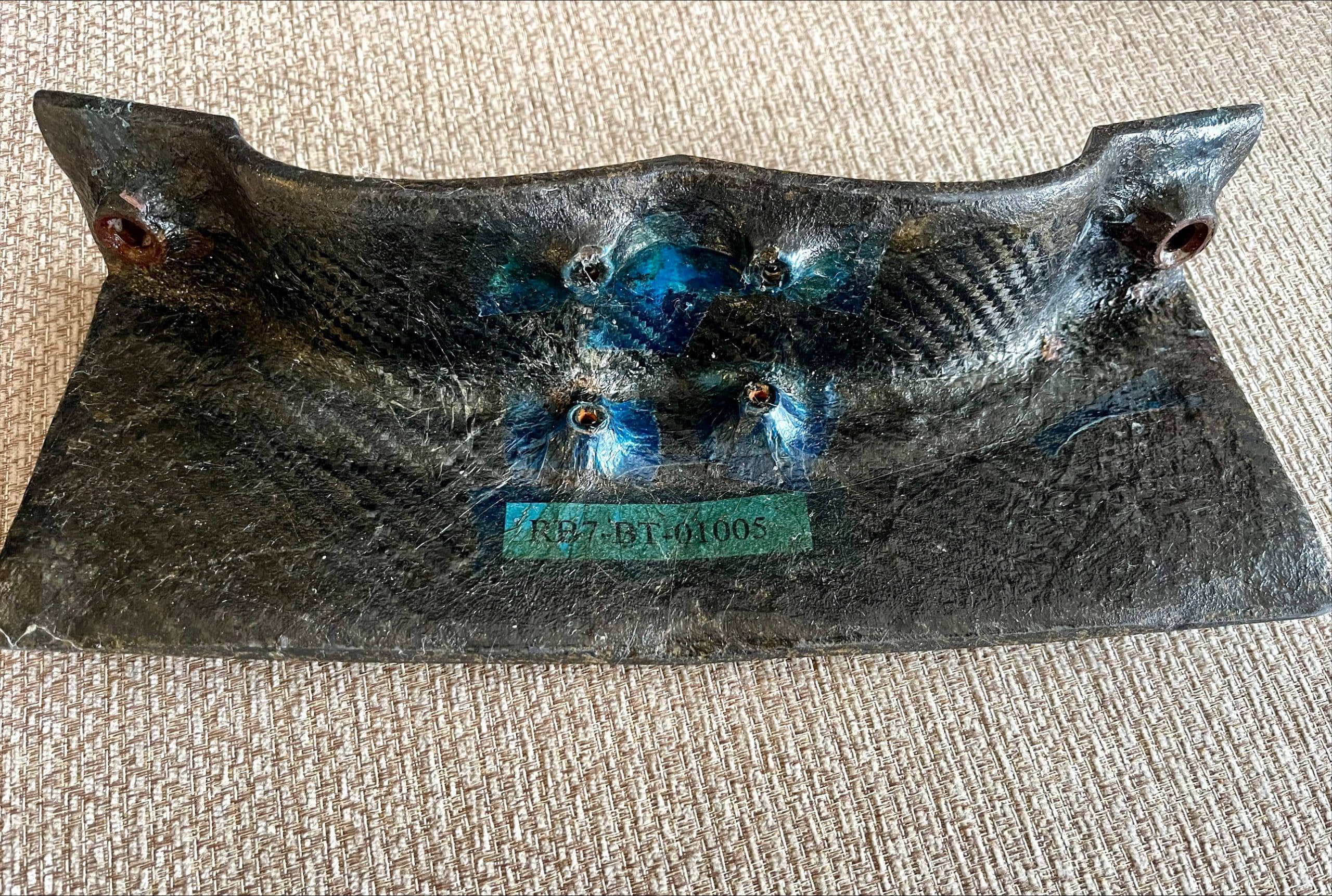 This carbon fibre piece was fitted to the World Championship winning Red Bull RB7 driven by Sebastian Vettel and is understood to be a trim part from within the cockpit, shaped to accomodate the driver’s lower legs.